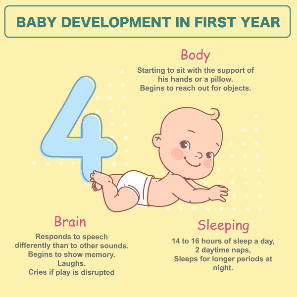 Dieťa začína stále viac a viac reagovať na podnety z okolia. Vďaka tomu, že dokáže svoje pohyby koordinovať a aktívne komunikuje džavotom, rôznymi zvukmi a úsmevom, rodičia už definitívne nadobúdajú pocit, že bábätko všetko robí vedome. Za 4 mesiace od príchodu z nemocnice si už mamička a dieťatko na seba dokonale zvykli a mamička sa už stotožnila so svojou mamičkovskou rolou. Netreba falošne očakávať, že všetko musí ísť podľa predstáv a s pribúdajúcimi týždňami sa rodič zbaví niektorých neduhov. Aj 4-mesačné bábätko plače, nechce spať alebo papať. Iné zasa všetko pchá do úst a veľa spí. Ideálna rovnováha nie vždy existuje. Čo dokáže 4-mesačné bábätko v tejto fáze rastu?