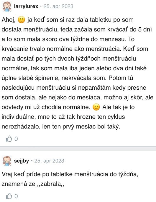 Na základe skúseností je možné konštatovať, že účinok tabletky po styku sa dostaví približne do piatich dní od užitia. Prejaví sa slabším krvácaním, avšak nasledujúca menštruácia sa môže potenciálne dostaviť v omnoho miernejšom prevedení, prípadne sa vôbec nedostaví. Je to tak v dôsledku hormonálnych zmien spôsobených núdzovou antikoncepciou. Každý prípad je však veľmi individuálny, a preto je ťažké zovšeobecniť dopad užitia tabletky „po“ na menštruačný cyklus.