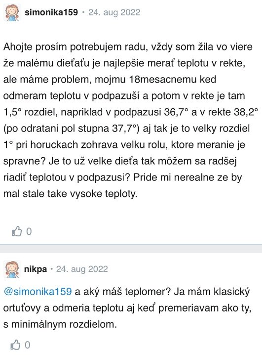 Viaceré mamičky považujú digitálne teplomery za nepresné. Meranie pod pazuchou je vhodné pre deti vo veku od zhruba 3 až 4 rokov. Niektoré mamičky praktizujú aj meranie pod pazuchou dieťaťa, čo si však vyžaduje jeho spoluprácu, inak je meranie nehodnoverné. Taktiež pri meraní cez rektálny otvor mamičky odporúčajú špičku namazať a hľadať teplomery s ohybnou a mäkkou špičkou.