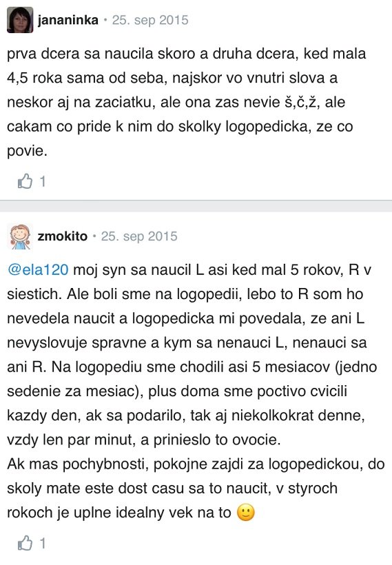 Mnohí rodičia tiež uvádzajú, že ich deti sa hlásku R naučili okolo veku 4,5 až 6 rokov, čo poukazuje na fakt, že u niektorých detí je vývoj reči pomalší a artikulácia dozrieva neskôr. Skúsenosti rodičov tiež hovoria o tom, že ak dieťa začína rozprávať skôr je vhodné v prípade nesprávnej výslovnosti začať s cvičeniami čo najskôr.