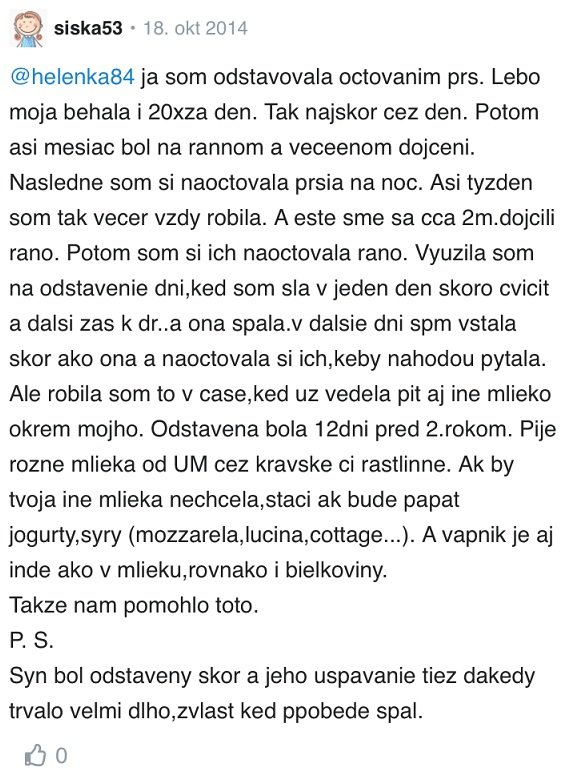 Odstavenie dieťaťa od dojčenia rieši skôr či neskôr každá mamička. Svetová zdravotnícka organizácia (WHO) odporúča plne dojčiť do ukončenia 6. mesiaca veku dieťaťa, potom je dojčenie vhodné kombinovať s príkrmami, a to až do veku 2 rokov. Dojčenie nie je pre dieťa len zdrojom potravy, ale aj spôsobom komunikácie. Dieťaťu dodáva istotu a upokojuje ho, často ním dáva najavo únavu.