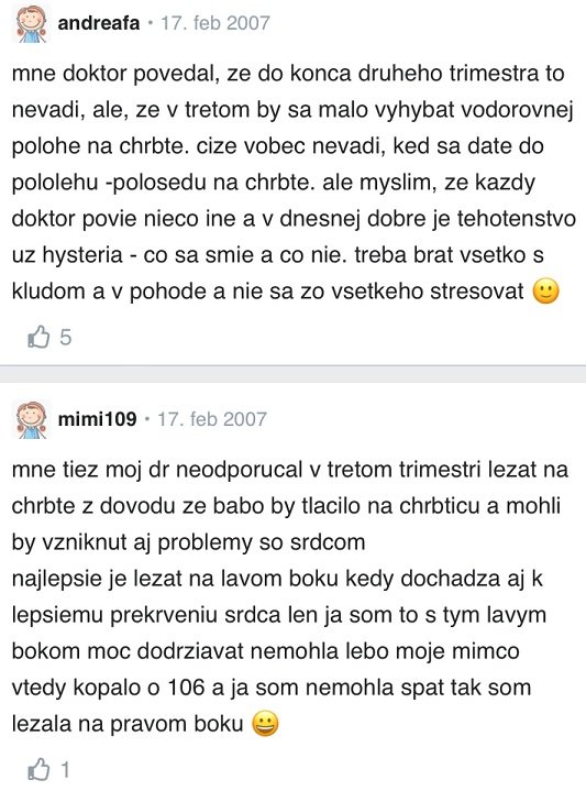 O svoje skúsenosti so správnou polohou spánku v tehotenstve sa podelilo mnoho mamičiek v diskusiách. Odporúčajú spať najmä na ľavom boku alebo v pololehu, polosede na chrbte, avšak vyhýbať sa nemusíte ani polohe na bruchu a na chrbte, ale len do 2. trimestra. V 3. trimestri už spánok na bruchu ani na chrbte nie je vhodný, pretože ohrozuje plod. Pri polohe na chrbte môže dieťa tlačiť na dutú žilu, narušiť prietok krvi a spôsobiť závraty.