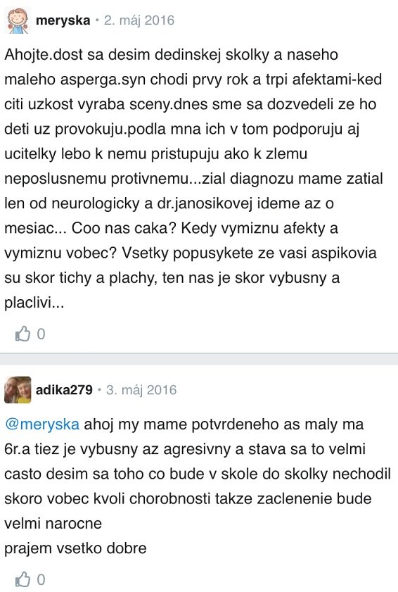 Mamičky v diskusiách potvrdili, že deti s Aspergerovým syndrómom sú okolím často nepochopené. Bývajú výbušné až agresívne alebo, naopak, tiché a plaché. Nechcú sa kontaktovať s inými deťmi a majú strach z nepredvídateľných situácií. Mamičky radia, aby sa k dieťaťu pristupovalo s trpezlivosťou, pretože dieťa s Aspergerom odpozeráva a učí sa rôznym situáciám. Pri prvom podozrení na tento syndróm odporúčajú návštevu lekára, ktorý diagnózu vyvráti alebo potvrdí. Tak najlepšie zistíte, v čom je problém a ako k dieťaťu pristupovať.