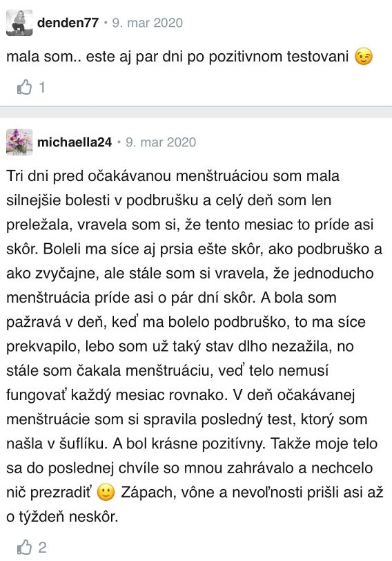 Budúce mamičky sa s menštruačnými bolesťami stretli na začiatku tehotenstva a považujú ich za jeden z prejavov gravidity. Išlo o silnejšie bolesti v podbrušku v čase, keď mala nastať menštruácia, bolesť pŕs i častejšie chodenie na toaletu. Rozťahovanie a rast maternice pripomínajú kŕče ako pri menzese. Niektoré mamičky užívali pri týchto bolestiach magnézium.