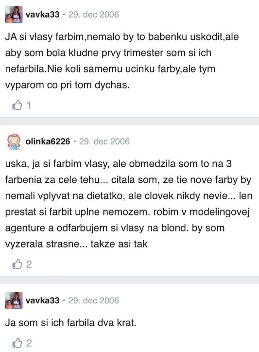 Téme farbenia vlasov v tehotenstve sa venovali aj dámy na známom diskusnom portáli Modrýkoník. Väčšina diskutujúcich sa zhodla v tom, že dnešné farby na vlasy neobsahujú také škodlivé látky ako v minulosti, a teda je melír, farbenie vlasov či odfarbovanie na blond úplne bezpečné. Hlavné je všetko prekonzultovať s odborníkom, ktorý vás ubezpečí a ešte vám prípadne poradí rad vlasových prípravkov, ktoré by ste mali v tehotenstve zaradiť do svojej vlasovej rutiny. Na rovinu tiež diskutujúce uviedli, že je lepšie s farbením počkať do konca prvého trimestra.