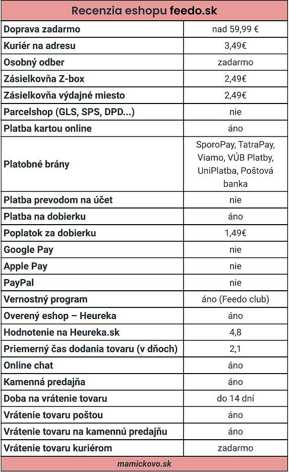 Vyzdvihujeme, že internetový obchod disponuje komplexnou produktovou ponukou v segmente starostlivosti o dieťa. Oproti konkurencii má e-shop prepracovaný svoj vernostný program s názvom Feedo Club, kde členstvom získavate zľavy na ďalšie nákupy i samotné produkty. Pri objednávke je možné získať dopravu zadarmo, ak suma presiahne hodnotu 59,99 €. Vďaka kamenným predajniam po Slovensku je možné vyzdvihnúť tovar priamo na predajni bezplatne. Okrem toho je k dispozícii služba Zásielkovne, doručenie do balíkoboxu. V prípade platieb výrobca pokrýva potrebné formy platby. Možná je aj dobierka (pozn. s príplatkom 1,49 eura).