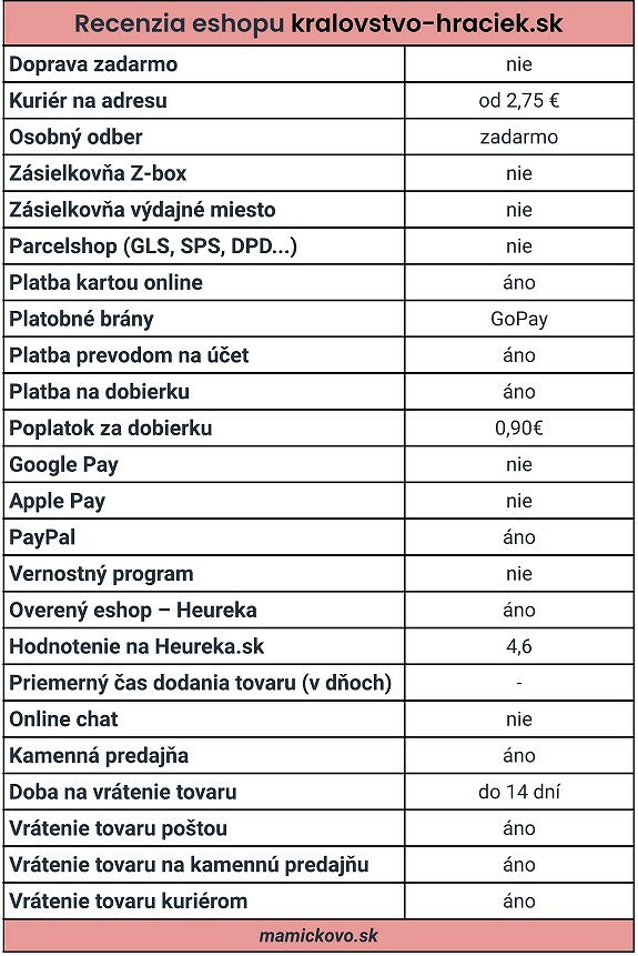 Veľmi pozitívne vnímame recenzie a odporúčania množstva spokojných zákazníkov. Páči sa nám rozsiahla ponuka detského tovaru. Takisto kralovstvo-hraciek.sk ponúka pre online hračkárstvo aj menej štandardný doplnkový sortiment – záhradný nábytok, bazény alebo doplnky pre psov. V prípade, že využívate platobný systém PayPal, e-shop umožňuje realizovať platbu aj touto formou (pozn. výška doplatku pri tejto platobnej metóde sa odvíja od celkovej sumy objednávky). Osobný odber v kamennej predajni (Tvrdošín) je bez poplatku. Cena dopravy kuriérom na adresu sa odvíja od rozmerov a hmotnosti objednávky. Základná suma za doručenie na adresu je oproti konkurencii nižšia.