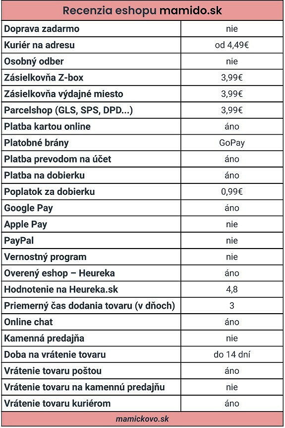 Pochvalné recenzie sú výsledkom toho, že 93 % zákazníkov nákup na mamido.sk odporúča. Celková spokojnosť zákazníkov s obchodom je na základe overených recenzií 4,8 z 5. Zákazníci sú spokojní s krátkou dobou doručenia, zvyčajne do 3 dní. Pozitívne hodnotenia v recenziách zahŕňajú aj pochvalu za kvalitu predávaného tovaru, prehľadný web a príjemný prístup pracovníkov. Záporné hodnotenia avizujú horšiu komunikáciu v prípade reklamácie alebo neskoré doručenie tovaru, napriek garantovanému termínu dodania. Prebehol váš nákup v tomto obchode v poriadku? Aké produkty ste v obchode nakupovali? Dorazila objednávka v avizovanom termíne? Dajte nám vedieť, akí spokojní ste boli s týmto predajcom. Budeme radi za vaše komentáre a názory.