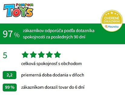 Až 97 % zákazníkov na základe dotazníka spokojnosti portálu Heureka.sk nákup u tohto predajcu odporúča (12/2023). E-shop má množstvo kladných overených recenzií od skutočných zákazníkov. Pozitívne recenzie pojednávajú hlavne o spokojnosti ľudí s rýchlym až expresným doručením, vybavením objednávky, komunikáciou a ochotou poradiť. V recenziách si kupujúci pochvaľujú aj široký výber hračiek či dokonca sortiment hier v maďarskej jazykovej mutácii. Negatívne recenzie sú pomerne neaktuálne a súviseli najčastejšie s oneskoreným doručením tovaru. Uskutočnili ste už online nákup v tomto e-shope? Páči sa vám jeho ponuka? Napíšte nám o svojej skúsenosti? Váš názor v diskusii môže pomôcť ostatným spotrebiteľom.