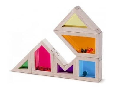 Senzorické dúhové kocky podporujú zručnosť a predstavivosť. Drevené kocky s priehľadným stredom pútajú pozornosť detí farebnými okienkami, cez ktoré prechádza svetlo. V niektorých sa nachádzajú perličky či piesok a vydávajú pri hraní zvuk. Drevené časti sú zafarbené nazeleno, namodro, nažlto alebo načerveno, použité farby sú netoxické. Balenie kociek pre deti od 18 mesiacov obsahuje 16 ks.