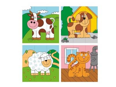 Pomocou 9 navliekacích drevených kociek sa dieťa učí sústrediť, precvičuje si obratnosť i motorické schopnosti. Kocky sú polepené obrázkami kravy, mačky, psa a ovce, skladajú sa na kolíky. Tie majú bezpečnostnú poistku a ohnú sa v prípade, že na ne dieťa spadne. Kocky sa dajú, samozrejme, použiť aj na klasické stavanie, takže sa dajú použiť podľa nálady.