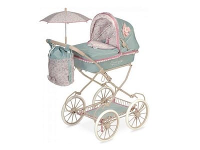 Skladací kočík pre bábiky s taškou a doplnkami. Disponuje ozdobným vakom, prešívaným krytom na vaničku, skladacím slnečníkom, matracom a dekou s jemným chlpom aj vankúšom v tvare cukríka. Retro kočík so španielskym dizajnom je vhodný pre bábiky do veľkosti cca 42 cm.
