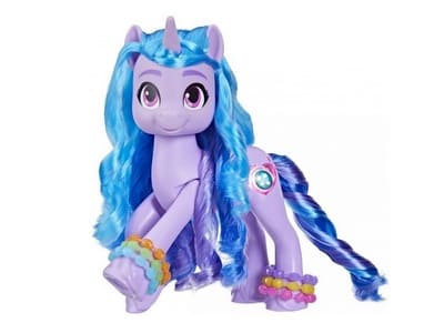 Postavička Izzy zo série My Little Pony je detailne spracovaná, dokáže vydávať zvuky, svieti a prehráva hudbu z jej piesne Fit Right In (3x LR44 batéria je súčasťou balenia). Dodáva sa s doplnkami na úpravu – hrebeňom a 7 náramkami. Výška hračky je 20 cm.