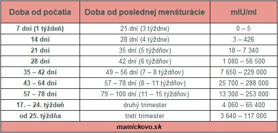 Hladina hCG v tehotenstve stúpa v prvom trimestri veľmi rýchlo a každých 48 až 72 hodín sa jeho hodnota zdvojnásobuje. Zatiaľ čo prvý týždeň je to 5,00 – 50,00 mIU/ml, druhý 50,00 – 500,00 mIU/ml, od 9. týždňa hladina dosahuje hodnotu 10 000,00 – 100 000,00 mIU/ml. Najvyššie čísla dosahuje v 12. týždni tehotenstva, potom hodnota klesá a ustáli sa až do konca tehotenstva.