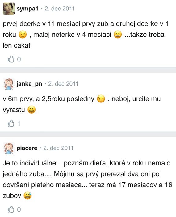 Prerezávanie prvých zúbkov je podľa mamičiek individuálne – niektorým deťom začali rásť v 6. mesiaci, iným v 11. mesiaci, či dokonca v 1 roku. Podľa skúseností sa deťom začínajú prerezávať zuby v cca 4. až v 12. mesiaci.