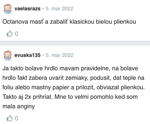 S bolestivými krčnými uzlinami sa stretol snáď každý človek, ktorý aspoň raz zažil silnú angínu či inú infekciu bakteriálneho alebo vírusového charakteru. Podľa rád z diskusných príspevkov je najlepšou „zbraňou“ na zmiernenie bolestí vzniknutých v dôsledku zväčšených uzlín práve octanová masť. Podľa niektorých diskutujúcich by mal účinkovať aj akýsi zemiakový zábal krku, na ktorého prípravu je potrebné uvariť a podusiť zopár zemiakov. Následne stačí rozložiť teplé zemiaky na fóliu, zabaliť ich do nej a priložiť ku krku. Potom už len obviazať plienkou alebo iným väčším kusom látky. Zemiakový zábal je možné prihriať aj dva- či trikrát. Podľa skúseností ide o efektívny spôsob boja s angínou a s ňou spojenými bolesťami krčných uzlín.