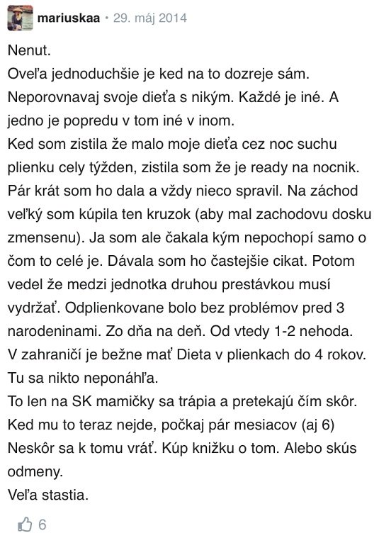 Fáza odplienkovania je pre rodičov i deti často náročným obdobím. Každý rodič i dieťa sa s odúčaním od plienok vyrovnajú inak. Aké sú vaše skúsenosti s odplienkovaním? Aká metóda odplienkovania fungovala u vás? Kedy sa vaše dieťa naučilo na nočník? Budeme radi, ak sa s nami podelíte o vaše názory, skúsenosti alebo poradíte ostatným rodičom. Zapojte sa do diskusie pod článkom.
