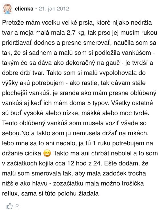 Nájsť polohu, ktorá vyhovuje mamičke aj dieťaťu a v ktorej sa obaja cítia dobre, si vyžaduje čas. Niektoré polohy dokonca pomáhajú pri konkrétnom probléme, napr. pri refluxe alebo po cisárskom reze. Ktoré polohy ste vyskúšali? Ktoré odporúčate ďalším mamičkám? Budeme radi, ak sa zapojíte do diskusie a podelíte sa o svoje skúsenosti.