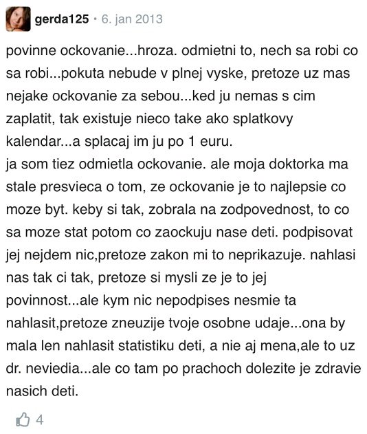 V súvislosti s ochorením rubeoly jedna diskutujúca podotkla, že by mali ženy nepodporujúce toto očkovanie v budúcnosti včas informovať svoje dcéry o ich nezaočkovaní proti tejto chorobe. Pri nákaze tehotnej ženy touto chorobou totiž môže dochádzať k nepríjemným komplikáciám, ktoré v niektorých prípadoch končia potratom.