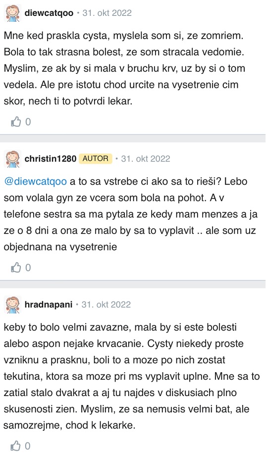 Skúsenosti žien s cystami sú rozličné v závislosti od zloženia a druhu samotnej cysty, ktorá im robila problémy. U niektorých sa našla prasknutá cysta s čírou tekutinou, na základe čoho lekári usúdili, že nie je potrebné zasahovať, pretože túto tekutinu dokáže vypudiť aj samotné ženské telo, avšak existujú prípady, keď mali ženy problém s krvavými ovariálnymi cystami. Za takýchto okolností sa pristupovalo k problému operačne, pričom následne ostávali ženy niekoľko dní v nemocnici. Ak žena pociťuje akékoľvek bolesti v oblasti reprodukčných orgánov, ktoré v minulosti ešte nezažila, je vhodné sa ihneď objednať na gynekologické vyšetrenie. Často sa práve včasným zásahom dá predísť zväčšeniu alebo prasknutiu vzniknutých cýst.